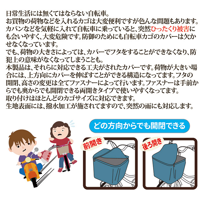 日常生活には無くてはならない自転車。お買物の荷物などを入れるカゴは大変便利ですが色んな問題もあります。カバンなどを気軽に入れて自転車に乗っていると、突然ひったくり被害にも会いやすく、大変危険です。防御のためにも自転車カゴのカバーは欠かせなくなっています。でも、荷物の大きさによっては、カバーでフタをすることができなくなり、防犯上の意味がなくなってしまうことも。本製品は、それらに対応できる工夫がされたカバーです。荷物が大きい場合には、上方向にカバーを伸ばすことができる構造になってます。